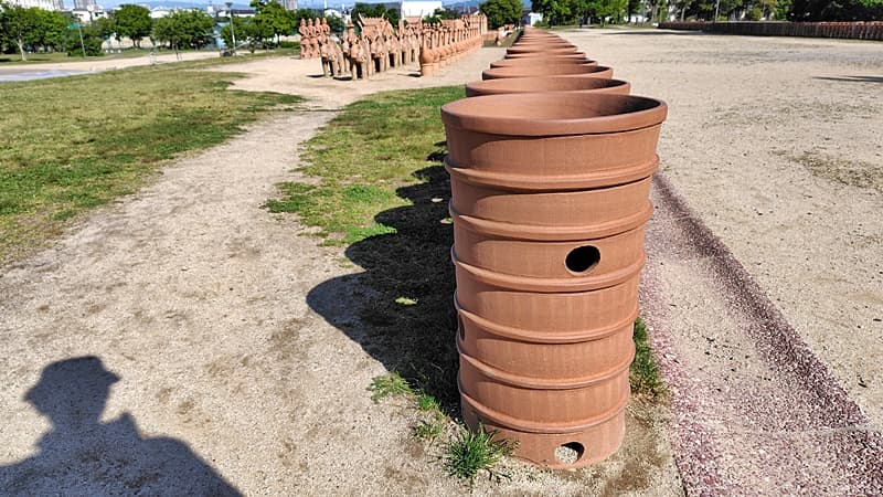 これも埴輪(はにわ)だそうで、円筒埴輪(えんとうはにわ)と呼ぶそうです。初めて見ました。左下は、本当に行ったよーということで、怪しい影も添えて。