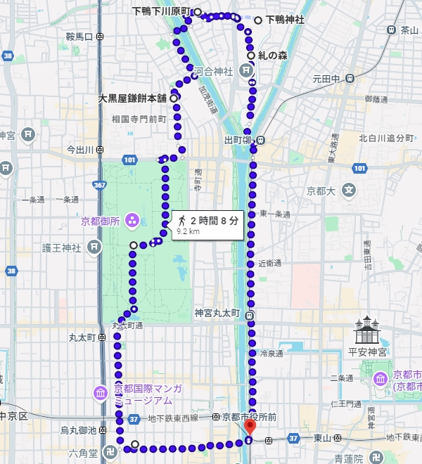 ということで,今回の散歩は,こんな感じ・・・8時半に家を出て,帰宅したのは2時半すぎ。散歩だけなら2時間ほどになりますが,鴨川の飛び石を渡ってうろうろしたり,下鴨神社や御所でもうろうろしたりしていました。夏場だとこうはいきませんが,水分をとりつつ,ゆったりと年の瀬の京都を歩くことができました。人が少なくてよかった!